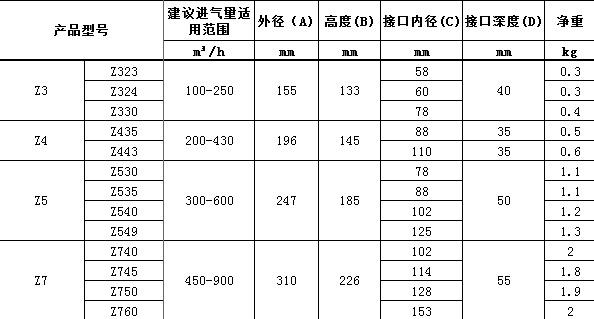 Z系列折返式空气预滤器选型表: